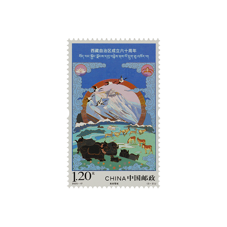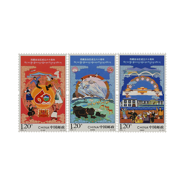 中国邮政定于2025年8月15日发行《西藏自治区成立六十周年》纪念邮票1套3枚。