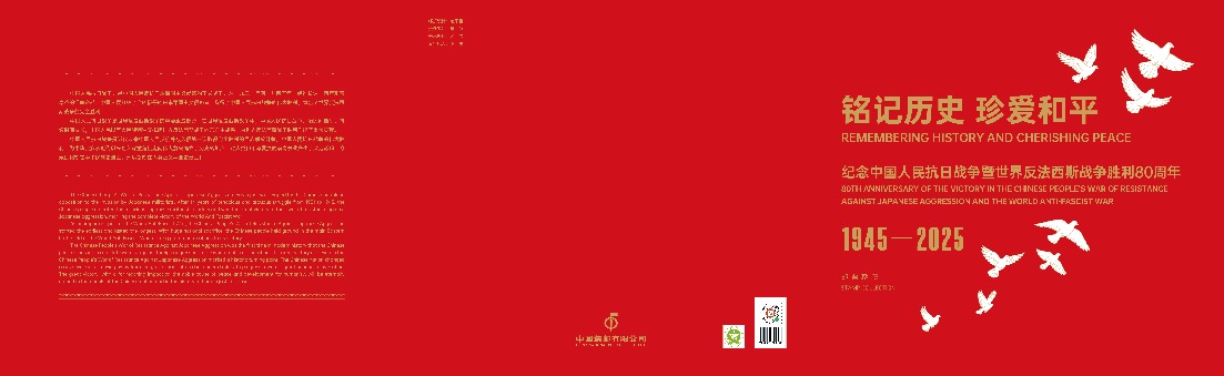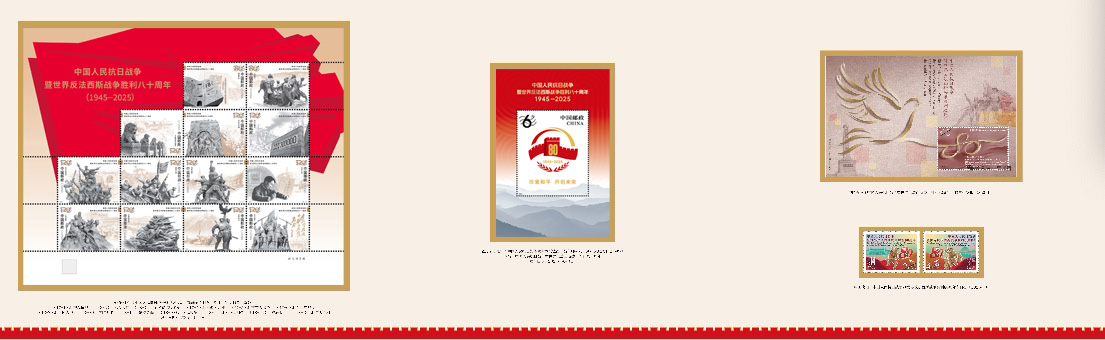中国集邮有限公司于2025年9月3日发行《铭记历史 珍爱和平》中国人民抗日战争暨世界反法西斯战争胜利八十周年邮折。内含《中国人民抗日战争暨世界反法西斯战争胜利八十周年》整版、小型张,中国香港、中国澳门发行的同题材邮票小型张及邮票。