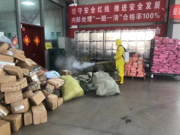 该分公司邮件处理中心工作人员在对场地、邮件及容器进行消毒