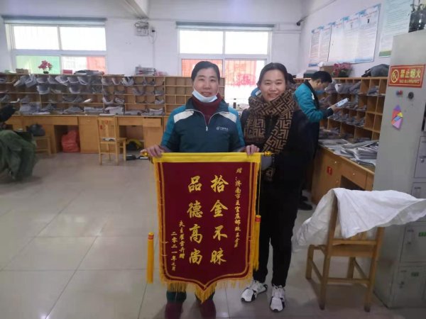 王金菊拾金不昧的高尚品质深深打动了翟女士,3月19日上午,翟女士来到王官庄投递部,向王金菊当面致谢,并赠送一面印有“拾金不昧,品德高尚”字样的致谢锦旗。钱包失而复得,翟女士十分激动,对投递员王金菊连连称赞。王金菊笑着说:“捡到东西归还失主,我们邮政员工都会这么做。”