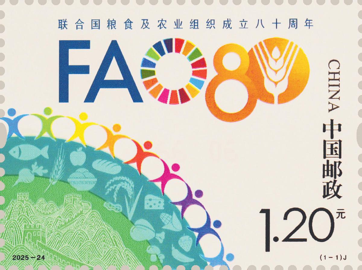 本套邮票图案以联合国粮食及农业组织八十周年纪念标识为主体,左侧的蓝色环形底色象征地球家园,前景展现了多样美食以及象征中国的长城元素,结合并肩携手的人物剪影,呼应2025年世界粮食日“手拉手共倡多样美食,聚合力同创美好未来”主题。